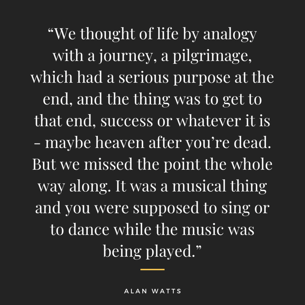 As Alan Watts said, life really is more of a play or a dance than a journey, as there is no future place to arrive at that you can conclude, “I have reached the end.” We treat life as a serious, point A to point B scenario. But it’s supposed to be about the living of it: