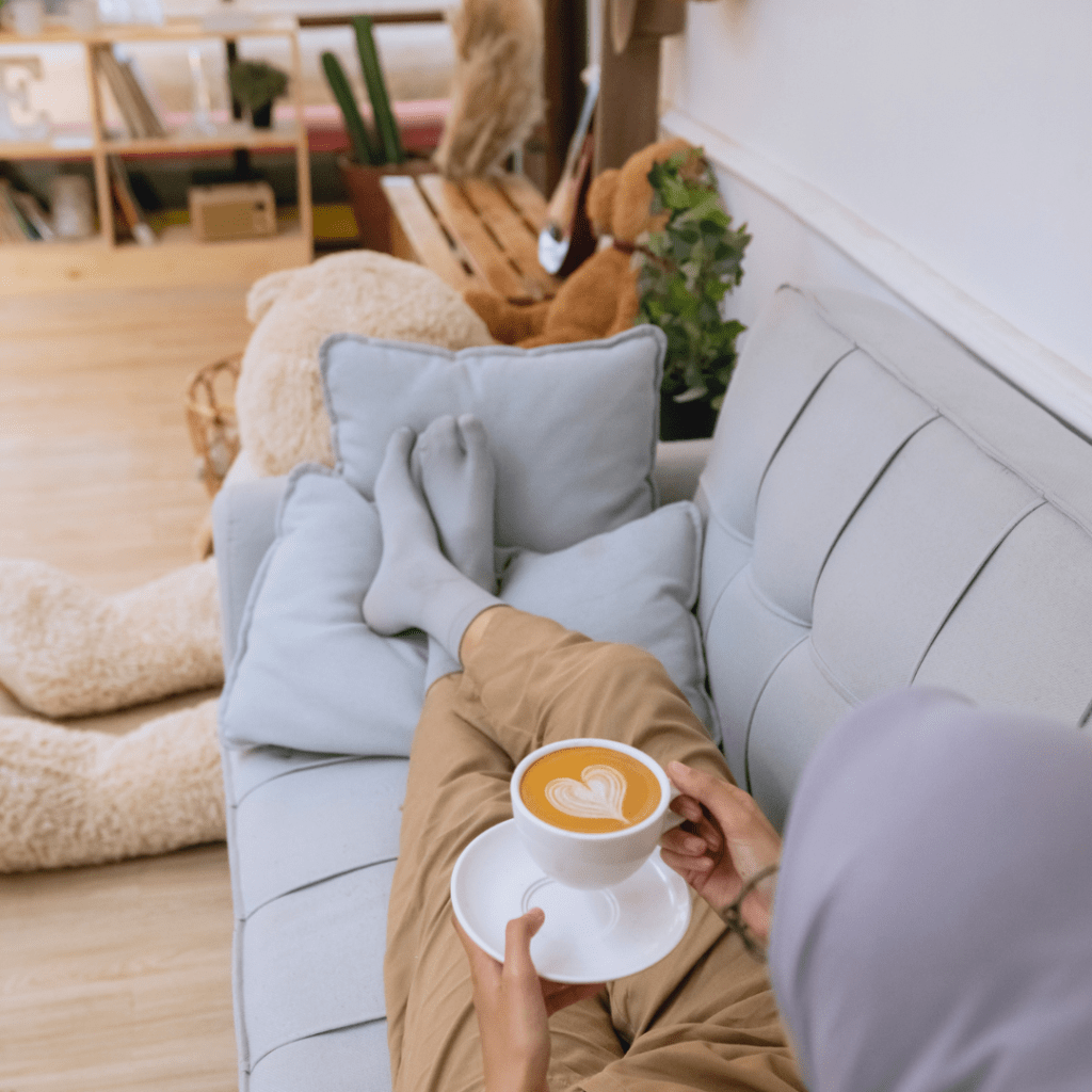 - Get Comfy: Create a comfortable space where you can unwind and feel safe. This can be in your bed, on the porch, it can be a blanket or favorite pair of pants. Make yourself more comfortable.